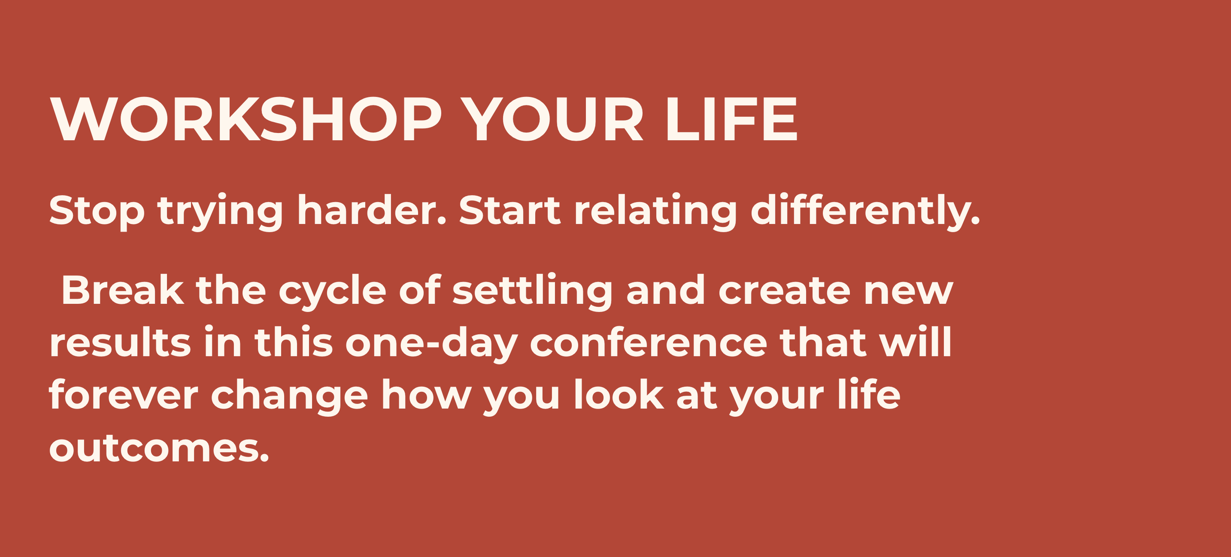 Workshop Your Life is a focused, practical experience designed to help you break that cycle. Through powerful training and talks, you’ll learn how to shift from pressure and self-sabotage into grounded, sustainable action—so real movement becomes possible in the areas that matter most.